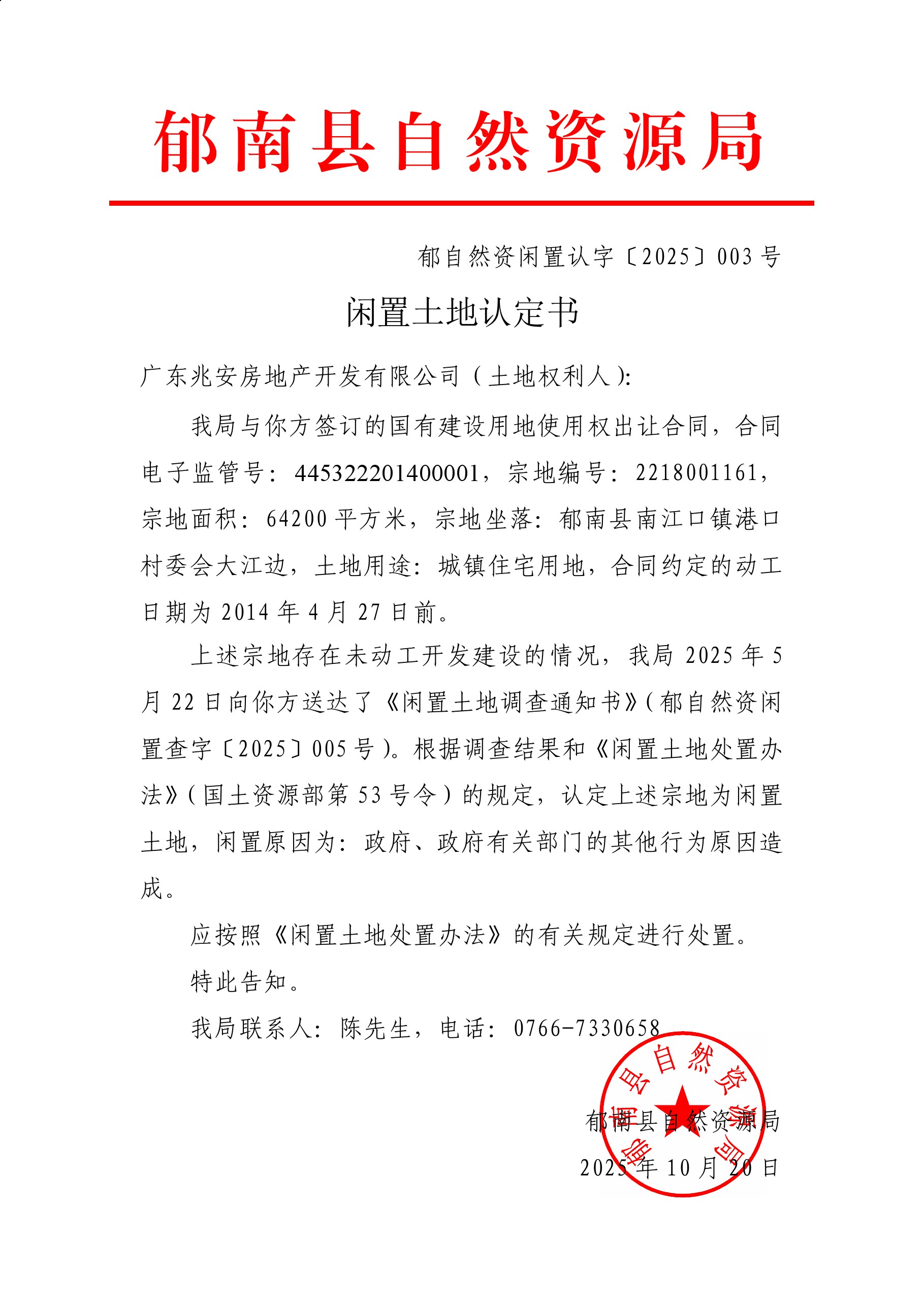 廣東兆安房地產(chǎn)開發(fā)有限公司名下登記的郁府國用(2014)第1668號、郁府國用(2014)第1669號土地使用權證,土地登記時間為2014年8月14日,土地用途城鎮(zhèn)住宅用地,宗地坐落:郁南縣南江口鎮(zhèn)港口村委會大江邊;宗地編號:2218001161,宗地面積:64200平方米。經(jīng)調(diào)查,該宗地自取得土地使用權至今未開發(fā)利用。