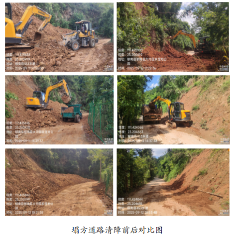 本次塌方共三處,總體積約250立方米。險情發(fā)生后,郁南縣水務(wù)局迅速響應(yīng),立即啟動應(yīng)急預(yù)案,組織搶險力量趕赴現(xiàn)場,全面開展應(yīng)急清障與道路搶通工作,面對緊急情況,聯(lián)合制定清障方案,緊急調(diào)集挖掘機、推土機、農(nóng)用運輸車及手扶拖拉機等設(shè)備4臺,連續(xù)晝夜施工,全力以赴推進搶通任務(wù)。