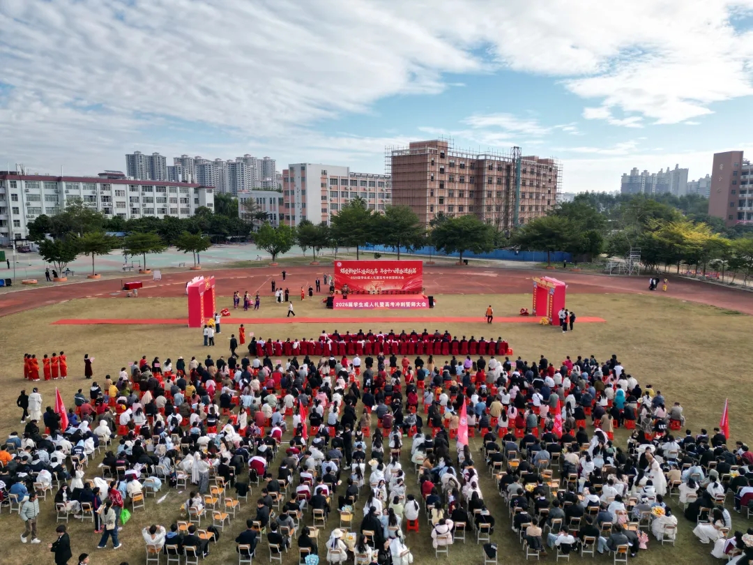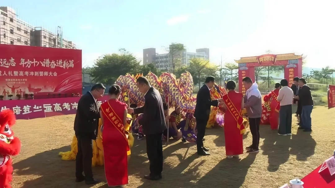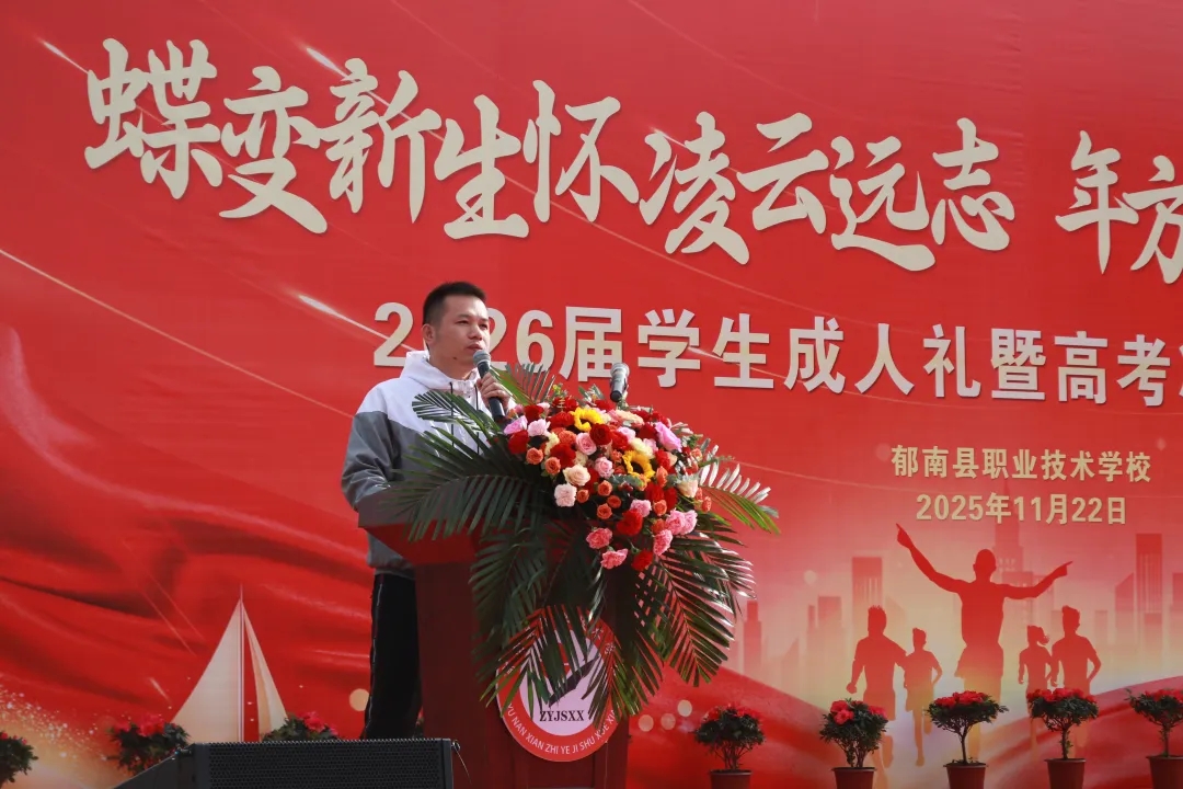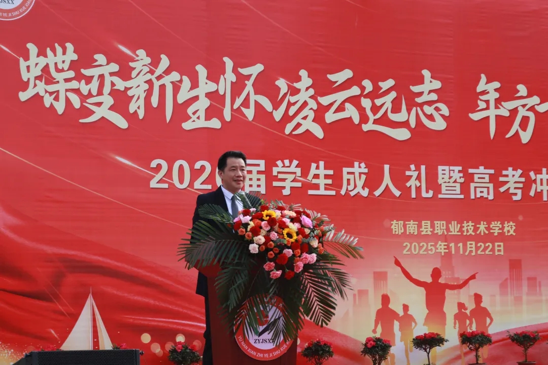 2025年11月22日上午,郁南縣職業(yè)技術(shù)學(xué)校足球場彩旗飄揚、禮炮齊鳴,2026屆成人禮暨高考沖刺誓師大會隆重舉行。大會以“蝶變新生懷凌云遠(yuǎn)志,年方十八譜奮進(jìn)新篇”為主題,縣政府副縣長溫伯榮、縣教育局副局長吳卓堯等縣領(lǐng)導(dǎo)和局領(lǐng)導(dǎo),學(xué)校班子與中層行政,23級高考部全體師生及家長代表共千余人齊聚現(xiàn)場,共同見證這一莊重時刻。