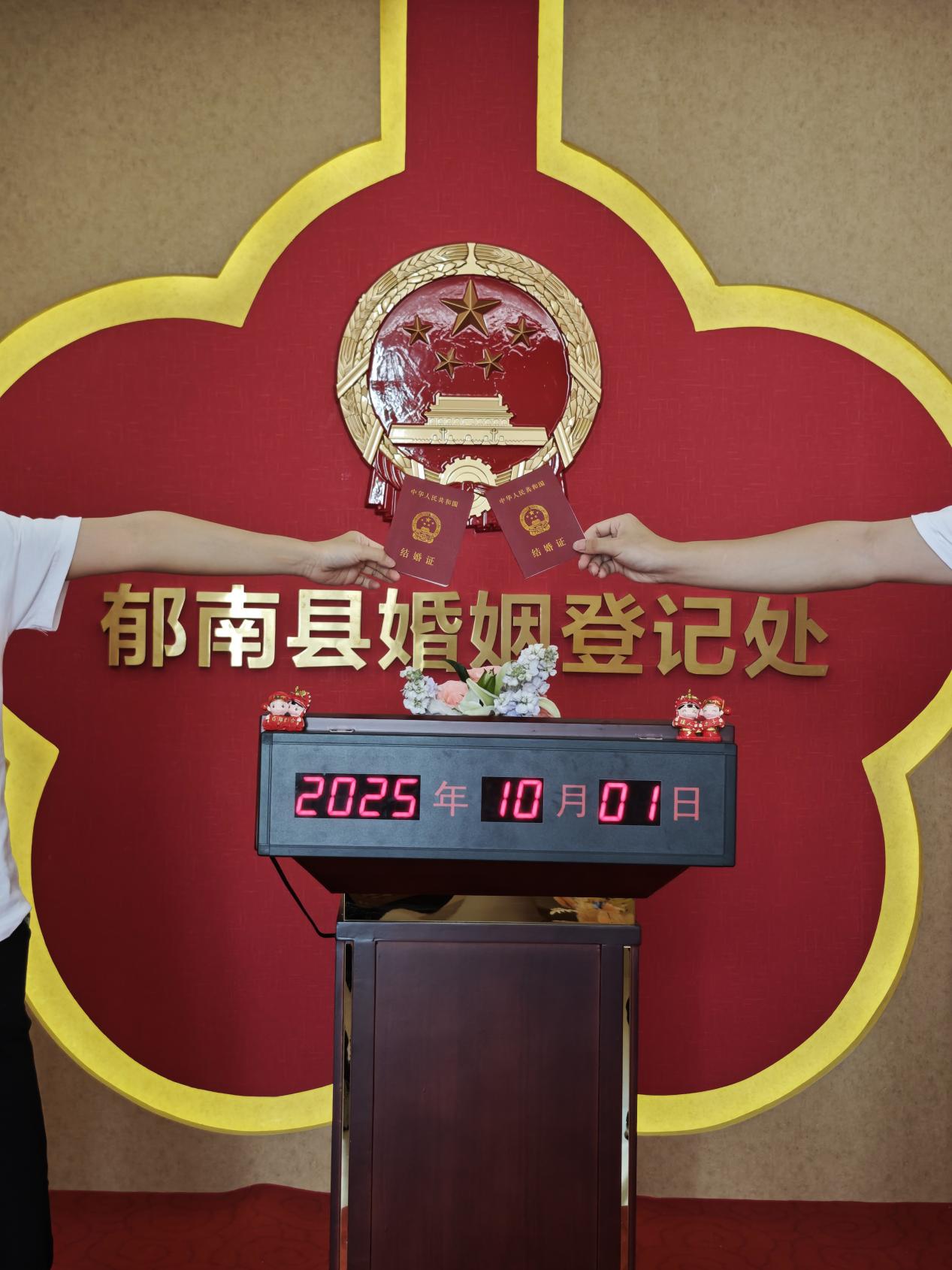 當(dāng)日上午8時(shí)起,新人陸續(xù)抵達(dá)登記處,在工作人員的引導(dǎo)下有序辦理手續(xù)。從材料核對到信息確認(rèn),從簽字領(lǐng)證到合影留念,每一個(gè)環(huán)節(jié)都充滿溫情?!澳茉趪鴳c節(jié)這天領(lǐng)證,讓小家的幸福遇上大國的生日,太有意義了!”剛領(lǐng)到結(jié)婚證的新人謝先生難掩喜悅。此外,工作人員還現(xiàn)場開展婚俗改革宣傳,倡導(dǎo)婚事新辦、儉辦,引導(dǎo)新人樹立健康文明的婚姻家庭觀念 。